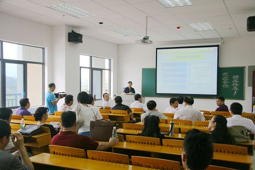 在多媒体教室,学院领导认真倾听了教育技术中心老师运用多媒体设备、校园网络等手段进行的试讲。