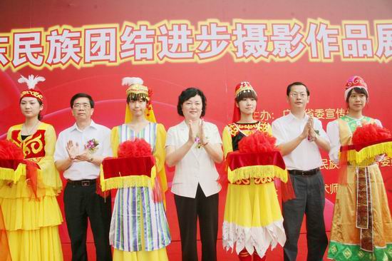 开幕式上,学院党委书记邝邦洪致欢迎辞。邝邦洪指出,广东省民族团结进步摄影展在我院展出,雷于蓝副省长以及省直有关领导亲临学院出席摄影展开幕式,充分体现了省委、省政府和各级领导对民族团结进步发展事业的高度重视,对我院的关心和支持。这次摄影作品展,以展现民族团结进步为主题,通过摄影作品充分展现我省民族地区改革开放以来经济发展、民族团结的时代风貌,满腔热情地讴歌党的民族政策。摄影展的作品题材多样,情境丰富,形象生动地表现了我省民族地区的山水风光、民族风情、民族风格、民族文化,以及少数民族群众生产生活的新信息和新风貌,让我院师生欣赏到高品位的艺术品,领悟到我国各族儿女在祖国大家庭中团结友爱、共同发展的情景,同时让各族师生受到一次深刻的爱国主义教育和民族团结教育。这次摄影展也为推动我院开展“以德为行,以学为上”主题教育活动,促进校园文化建设提供了一个良好的平台,为提升我院民族文化艺术的教学与科研水平,弘扬中华民族优秀传统文化,起到了积极的促进作用。学院将以此为契机,不断提高办学实力和办学水平,深化校园文化内涵建设,突出爱国主义和民族团结的主题教育,为推动各民族共同繁荣发展进步,构建和谐社会作出自己应有的贡献。
