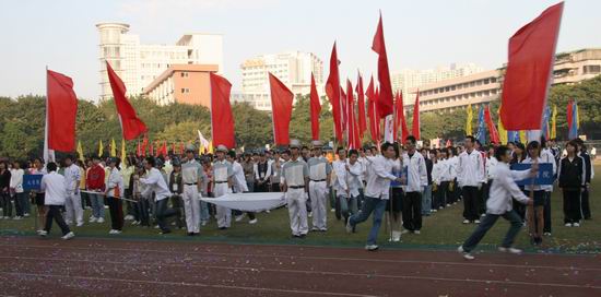 14日上午,校运会在庄严的国歌中拉开了序幕。校领导邝邦洪、王乐夫、李月、吕清、罗海鸥、潘自勉、林伦伦、林卓、冯灿仪、王培林以及校运会组委会全体成员出席了开幕式。