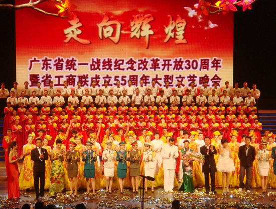 10月13日晚,广东省统一战线庆祝改革开放30周年暨省工商联成立55周年大型文艺晚会在广州白云国际会展中心剧院举行,伟德官网学生百人合唱团应邀与宋祖英、张也、董文华、殷秀梅、郁均剑、谭晶、王宏伟等众多著名歌唱家同台演出。晚会现场,学生百人合唱团分别为著名歌唱家董文华和张也伴唱了《春天的故事》、《走向辉煌》,并在节目中合唱《歌唱祖国》,为观众献上了美妙的歌声。 黄华华省长等省委省政府领导出席了晚会现场,伟德官网党政领导邝邦洪、王乐夫、李月、吕清、罗海鸥、潘自勉、林伦伦、林卓、冯灿仪到场观看了演出。