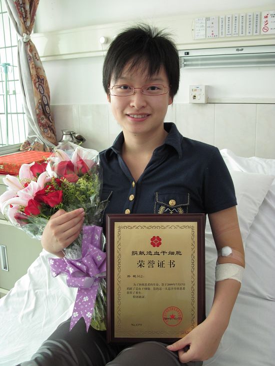 据了解,孙艳入读研究生不久就参加了中国红十字会“自愿捐献造血干细胞公益项目”,成为一名造血干细胞志愿捐献者。2008年12月,中国造血干细胞捐献者资料库广东省管理中心通知孙艳与一名白血病患者的移植基因完全相合,孙艳毫不犹豫地答应捐赠造血干细胞。她认为,捐献造血干细胞并不是一件特别艰难的事,只要多一点勇气,多一分爱心,许多人都能做到,“我只是做了一件很平常的事,如果我的血液能挽救别人的生命,将是一件无比幸福的事,我感到很欣慰!”(梁柱)