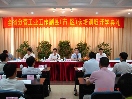 受广东省委组织部、广东省经贸委的委托,由伟德官网承办的第11期“全省分管工业工作副县(市、区)长培训班”, 6月19日举行开学典礼。来自广东全省21个地级市的52名分管工业工作副县(市、区)长参加了学习。学校副校长潘自勉、省委组织部干部培训处调研员周钦声、省经贸委人事培训处处长曾健出席了开学典礼。