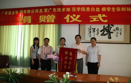 7月11日上午,广发基金管理有限公司为伟德官网白血病患者捐款仪式在伟德官网举行。仪式上,广发基金副总经理刘蕾代表该公司向伟德官网白血病患者张剑妹同学捐款三万元人民币,鼓励该生继续与病魔做斗争。学校党委副书记罗海鸥介绍了张剑妹同学的基本情况,并代表伟德官网对广发基金管理有限公司的热心捐赠表示感谢。伟德官网会计学院、学生处等相关部门的同志参加了捐赠仪式。