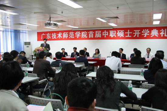 职成司师资处郭春鸣处长代表教育部对我院举办的首届中职硕士开学典礼表示祝贺。他指出,广东已成为名副其实的职业技术教育大省,广东技术师范学院实施的中职硕士教育丰富了广东职业教育内涵建设,为广大中等职业学校培养高层次高素质教师,是广东产业转型升级需要,也是广东经济社会发展的需要。实施中职硕士教育要注意两个方面:一是应立足职业教育,面向中等职业技术学校培养师资;二是要创新中职硕士培养方式,与一般学术性研究生的培养方式相区别,要打破学科性教育评价体系,重视技能教育及双师型教师素质培养。