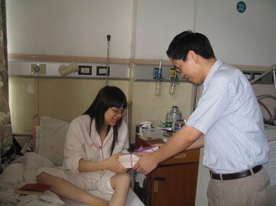 朱明晶感谢校领导在百忙之中亲自到医院来看望她,感谢学校有关部门以及全校师生为她所做的一切,表示一定全力配合医生接受治疗,争取早日康复,争取回报社会,回报所有关心支持帮助她的人们。