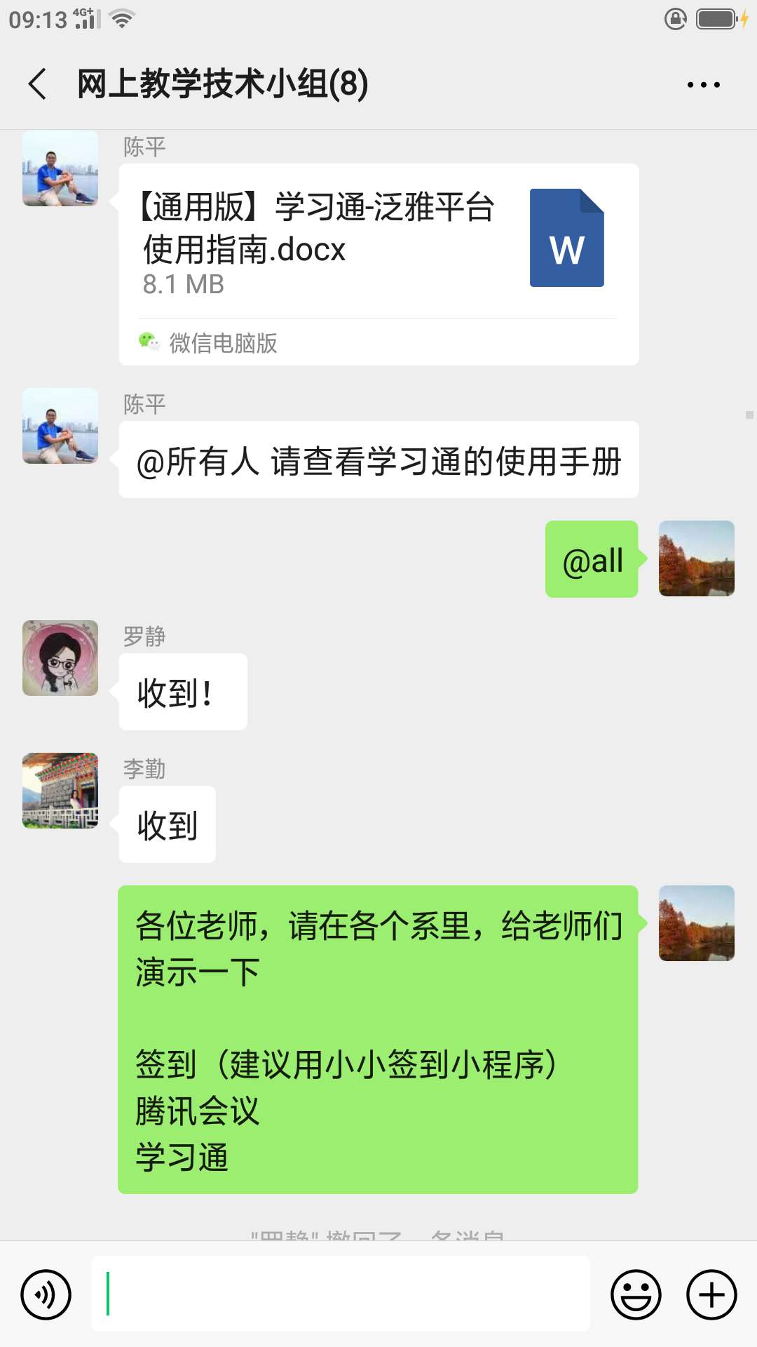 为帮助任课教师解决线上教学困难,提供网络教学的技术咨询与辅导,选派课堂教学质量优秀、网络技术水平高的教师成立线上教学技术小组,组长:蔡军,成员:李勤、陈富强、罗静、江炼、陈平、刘福星、李洁伦。16日,小组召开了工作会议,对相关问题进行了讨论、研究、测试,推荐线上教学平台和在线直播平台。各系通过腾讯会议等组织学习各种平台,试用各种工具,授课教师初步掌握线上教学模式,并与学生建立了联系。