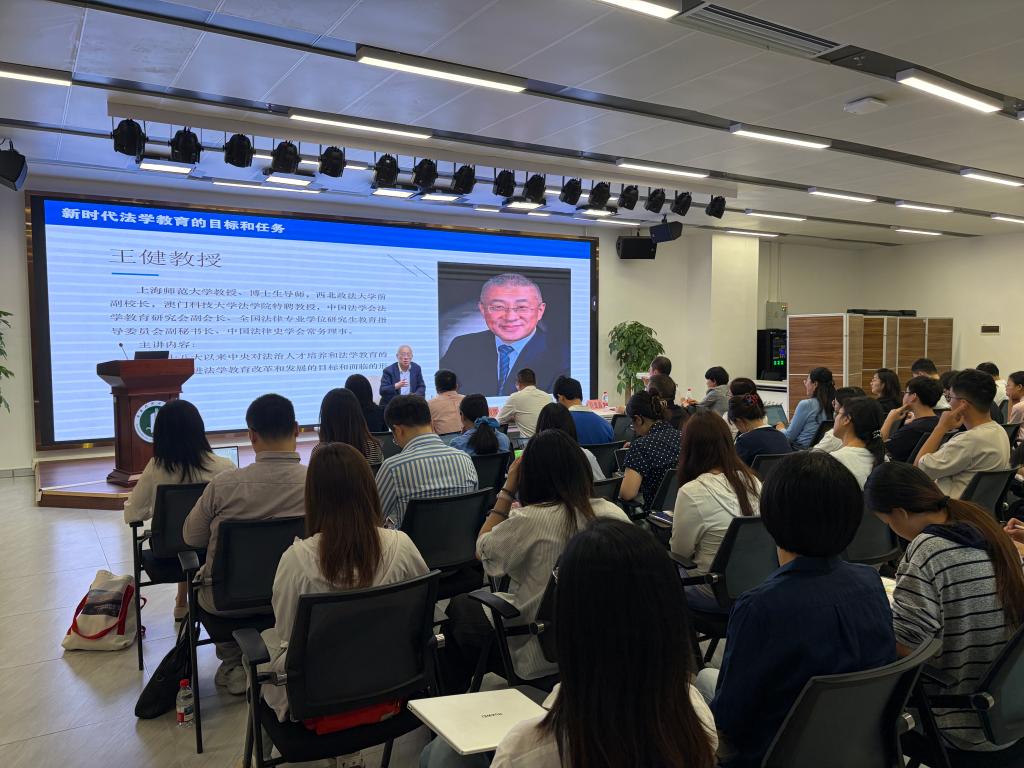 王健教授以其深厚的法学学术造诣和丰富的教育管理经验,立足历史纵深,从中国历史上第一位法律职业人皋陶讲起,依次剖析从古代律学兴起到近现代法学教育转型发展的全过程,细致拆解中国古代法律体系及法学教育的历史沿革,系统梳理中国古代法学教育的发展脉络与传承逻辑,完整勾勒出中华法系法学教育的传承轨迹。在此基础上,他阐释传统法律教育的精神内核,并层层引申出对新时代法学教育核心目标的深度思考,紧扣党的十八大以来党中央关于法治人才培养和法学教育的系列决策部署,进一步解读新时代法学教育改革的发展形势与重点任务,为在场师生带来了一场思想深邃、内容翔实的精彩报告。