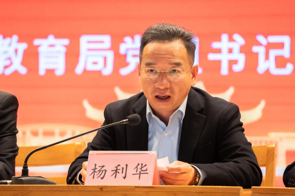河源市委教育工委书记、市教育局党组书记、局长杨利华发表讲话。杨局长强调,本次博览会是落实教育强国战略的具体行动,旨在通过展示成果,推动河源教育与时俱进。他对活动组织工作给予充分肯定,并号召全市教育工作者以此次活动为契机,进一步加强校园文化建设,提升数智教育水平。