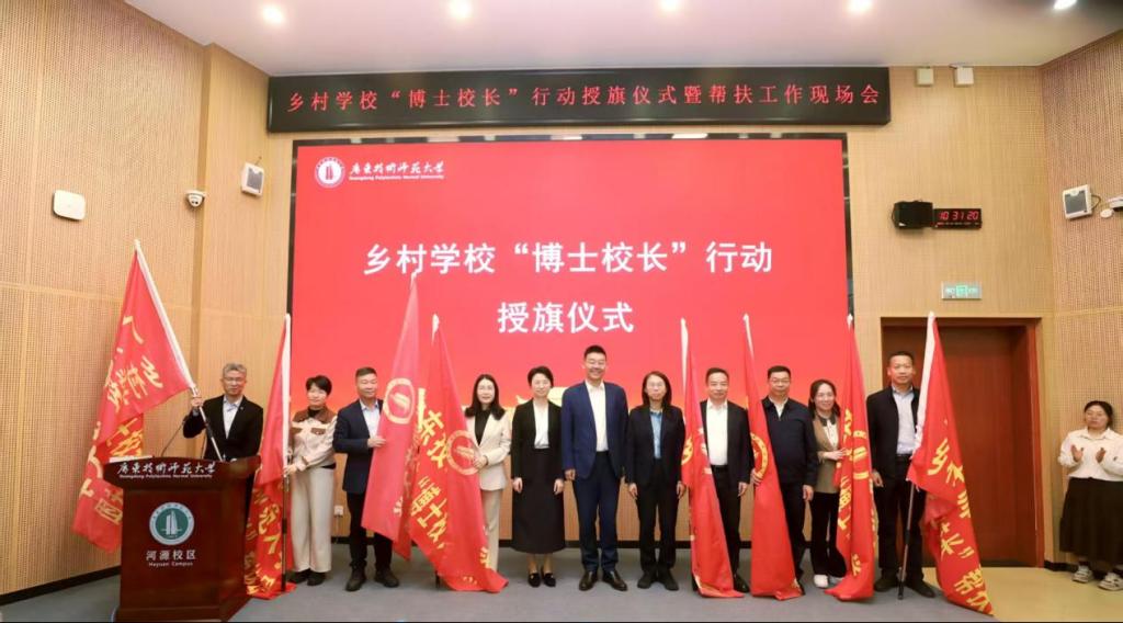 在授旗环节,河源市委常委、宣传部部长谢春艳为市直学校和7个区县的“博士校长”团队逐一授旗,标志着“博士校长”正式进驻乡村学校,开启教育帮扶新征程。